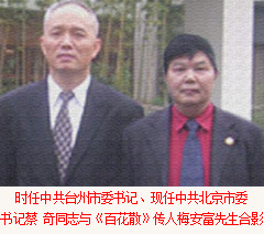 梅安富先生軍人出身(曾經(jīng)在中國馬蘭核試驗基地工作十多年,為核武器發(fā)展做出了卓越貢獻(xiàn)、被評為八級軍殘)、高級經(jīng)濟師、中共優(yōu)秀黨員、天臺山人氏,F(xiàn)任中共鄭州臺州商會支部委員會書記、常務(wù)副會長兼秘書長、河南省保健品協(xié)會副會長、全國政協(xié)副主席、中共中央委員、中國殘聯(lián)主席鄧樸方先生與鄭州臺州商會支部書記兼秘書長、《百花散》傳人梅安富先生親切交談鄭州市腫瘤康復(fù)協(xié)會名譽會長。2005年5月,作為臺州古代中醫(yī)秘方梅氏《百花散》